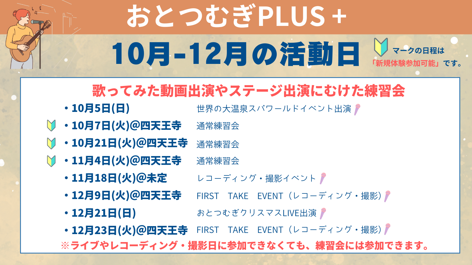 ①月2回(火曜日)のおとつむぎPLUS+の活動日への参加チケット ②2ヵ月に1回のレコーディング・動画撮影イベント(カテゴリⅠ)参加チケット ③音楽コミュニティおとつむぎライト会員チケット ※レギュラー会員・U35会員への変更も可。 ④その他、開催がある場合はイベント(カテゴリⅠ)参加チケット ※イベントの料金カテゴリによって、追加参加費(参加任意)がかかる場合があります。 料金カテゴリについては別表参照。 |
